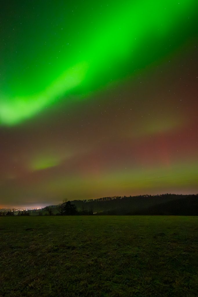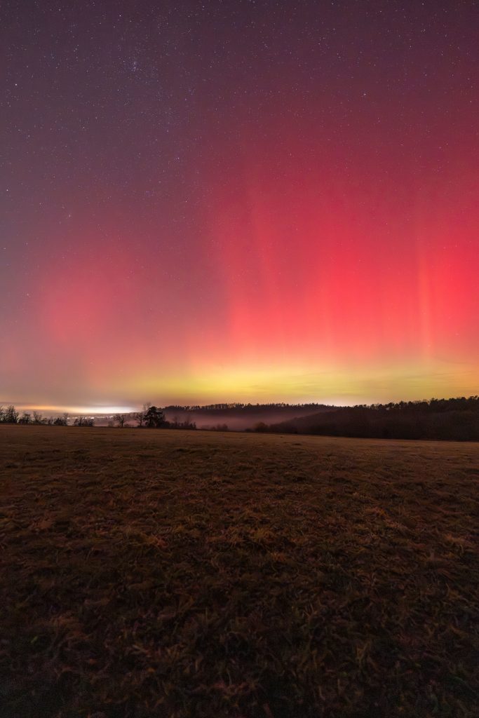Spät am Abend kam dann der Moment, der die Theorie plötzlich real gemacht hat: Gegen 22:30 Uhr ploppte eine Meldung auf: „In den nächsten 15 Minuten bei dir sichtbar.“ Ich war erst sachlich, fast kalt. Kopf aus dem Fenster, Kamera Richtung Norden, ein paar Bilder – mehr Routine als Romantik. Und dann: Auf den Aufnahmen dieses leichte Schimmern, dieser Magenta-Stich. Nicht spektakulär für das Auge, aber eindeutig für den Sensor. Das ist typisch für schwache Aurora in mittleren Breiten: Die Kamera sammelt Licht, während das Auge noch überlegt, ob es sich das gerade einbildet.